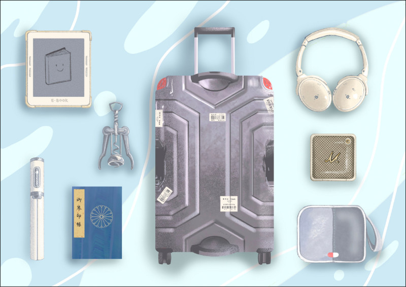 行李箱的功能,是收納,也是取出,是封藏,也是打開。除了必備的衣物、盥洗用具,我打包時一定要放入行李箱的物品有:紅酒開瓶器、藥品收納包、耳機、自拍棒、藍牙喇叭、電子書閱讀器(以前是紙本書)、御朱印帳(日本寺院參拜納印用的,目的是收集參拜的紀錄)。幾十次飛行後,變形金剛外殼多處擦傷,航空公司的條碼貼紙彷彿是它的勛章。