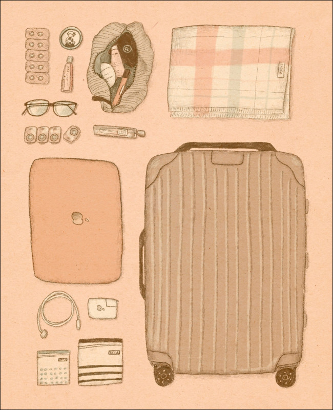 登機箱好在讓一切還有救。比方說,我一定在其中放一盒備份隱形眼鏡與一支備份眼鏡(以防託運行李出問題);準備一些常備藥(來自於班機取消長時滯留機場的經驗);夾層裡有幾枚乾淨夾鏈袋與部分備用現金。化妝包與小瓶香水若塞在肩背包,太蠢重了,丟進去。如果必須帶筆電上路當然也是放這裡最好。還有最後在免稅店(或者,羽田機場出境登機門附近那個7-11!),難抑惆悵亂買一通,也統統塞進來,可免大袋小袋狼狽不堪,很多事情細想一想,會發現根本沒必要下意識嘿呦嘿呦全都用扛的,最後還能買杯咖啡捏在手上,雖然通常不是很好喝,也喝不完,還很貴,但就是想買。不過最重要還是每次旅行尾聲,我會將各種嬌滴滴的、可不能弄丟的、捨不得離開眼前的路上斬獲全部歸納其中,貼身拉著上機,為此我漸漸磨練出俄羅斯方塊或者俄羅斯娃娃似的規整工夫(俄羅斯怎麼回事?),沒有一件內容難為橫豎,沒有一處畸角枉自虛無,若隨機遇到入關抽查,一口氣打開來,可真是抬頭挺胸。