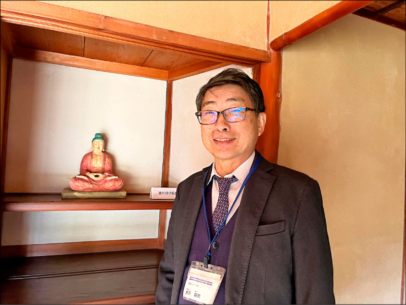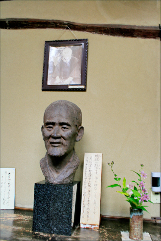 十五年後再訪,在玄關脫鞋後進屋,便有一中年男人等在身前,他問過我從哪裡來,便領我登上二樓。每日參訪者數以百計,這個為我導覽的中年男人卻待我如唯一的客人,熱切、熱情,鉅細靡遺地解說,窘於溝通的細節,除了換個說法,還拿出手機上網翻譯。我心想,這是志工吧,真是專業,也不免好奇他的真正身分。終於找到一個空檔,我問,可以幫你拍照嗎?他大方應允,喀擦幾張照片,我藉此看清楚掛在他頸間的名牌,知道了他叫大原莊司,是志賀直哉故居館長。