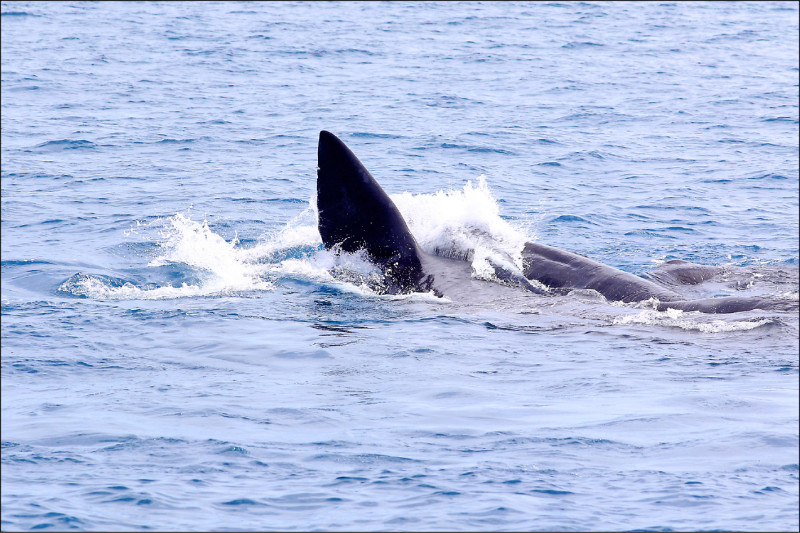 離港後船隻筆直離岸,不到半小時直接發現天邊數起抹香鯨噴氣。從發現噴氣到船隻接近到牠們舉尾下潛,標準的抹香鯨接觸過程打開了這航次的序幕,這天的重頭戲即將重磅登場。工作船東方海面約五百公尺處突兀激起一陣高聳的湧滾浪花,似海面掀起的一記驚歎號,立即解放了船上每張喉嚨禁不住的歡呼。