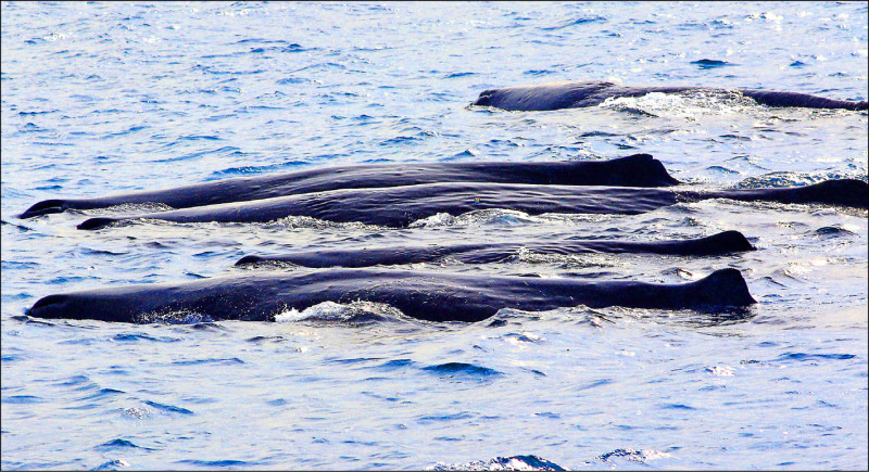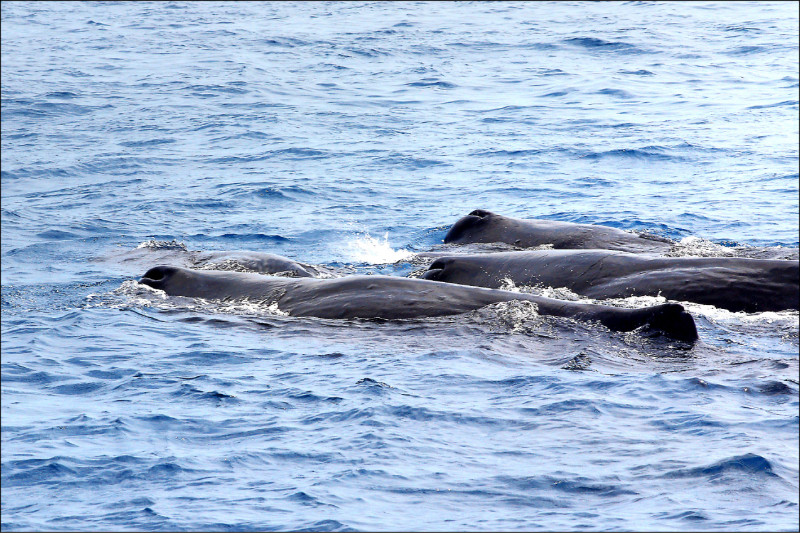 自2023年啟動的「拜訪太平洋抹香鯨π計畫」,進入第三年,前兩年收集的資料顯示,幾乎可確定每年三到十一月間,以七、八月為高峰,有數個抹香鯨家族分批經過台灣東部沿海。特別在2024年觀察到牠們在我們海域生產、育嬰,以及在我們海域集合睡眠的紀錄。當時還跟報名參加計畫航班的朋友開玩笑說,「第一次出海就遇到抹香鯨海上觀察的天花板,以後可以不用來了。」