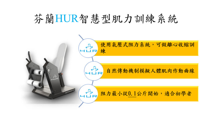 芬蘭HUR智慧型肌力訓練系統是銀髮族健康促進設備的第一品牌,其操作系統與機械結構符合人體工學,其智慧管理系統可根據量測的肌力設計記個別化訓練模組、運動訓練強度、運動劑量與頻率,只要將資料存取在卡片裡和每項運動機台做配對,運動機台就會自動調整運動參數及姿勢,是一套操作簡單又能客制化調整的肌力訓練系統。