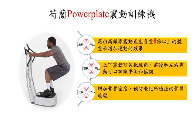 其專利「加速訓練」(Acceleration TrainingR)可以產生每秒高達35次和諧、穩定的振動頻率,讓全身肌群產生自然反射,提高運動的效率與效果,簡單、高效率、低衝擊的運動方式,讓在相同的時間下,達到更多的運動效果!研究顯示,每周進行3次、每次10分鐘、20Hz以上頻率之全身振動訓練,可有效增進年長者之下肢肌力與爆發力、改善身體姿勢穩定控制及預防跌倒。