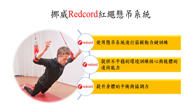 源自於挪威,原是用來解決治療下背痛的問題,是以治療為出發點,後續經過不斷改良演變成為多用途的訓練模式。Redcord 紅繩懸吊運動是利用獨有的紅色懸吊繩與其輔助配件,提供身體一個不穩定性的狀態,能夠訓練身體深層的小肌群,提升核心的穩定力及穩定軀幹的能力。