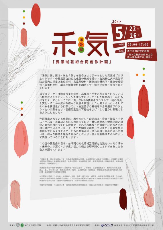 「禾気計画」展は、米と「気」を融合させてテーマとした異領域プロジェクトです。中華民国(台湾)文化部の補助を受け、台湾輔仁大学民生学院が院内の児童と家庭学科・食品科学科・博物館学研究所・餐旅管理学科・栄養科学科・織品と服飾学科を融合させ、協同で企画・実行を行っています。
