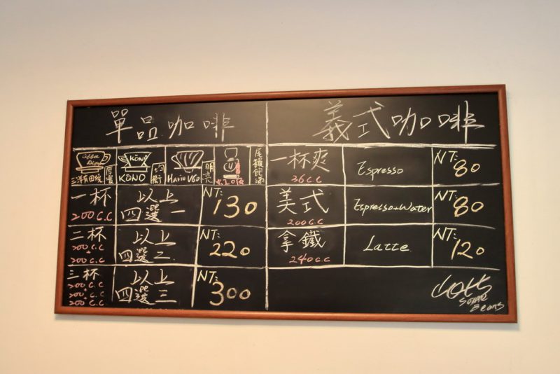 山日比SomeBeans的空間非常小,大概不到2坪大,裡面就一個可坐4位客人的吧台座,吧台前方擺放了不同產區的咖啡豆,座位後方的架子上擺滿了分裝好待售的各式豆子,一側的牆上則掛著大黑板寫著消費方式。