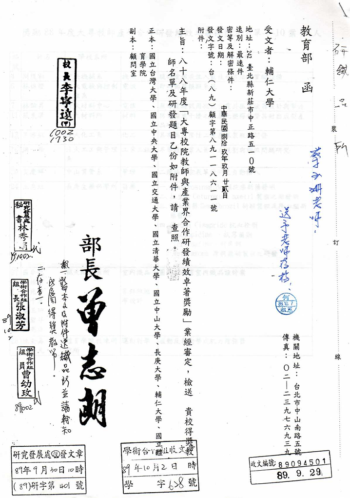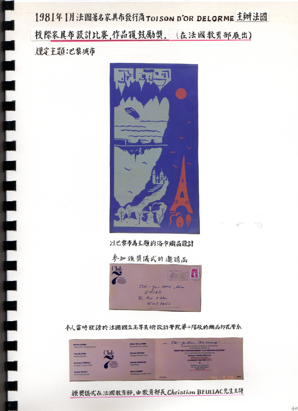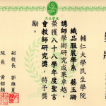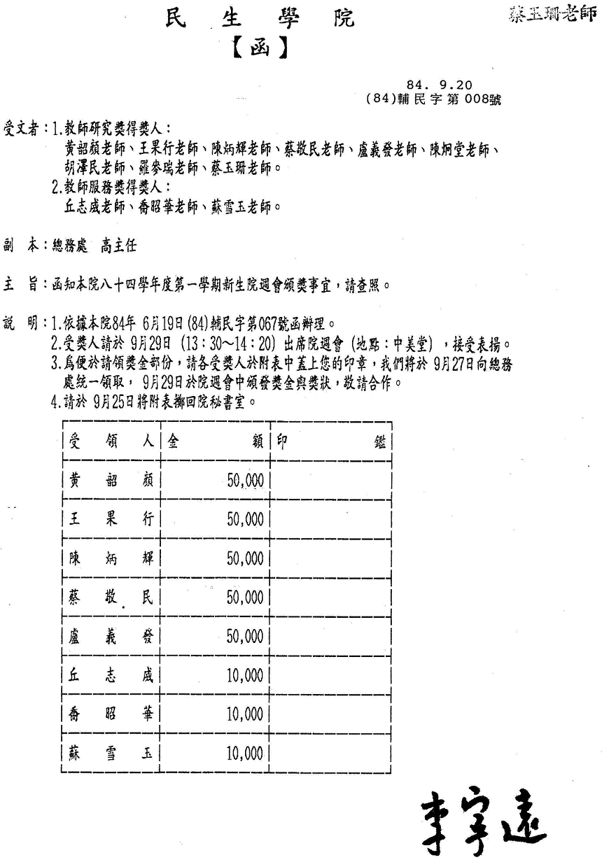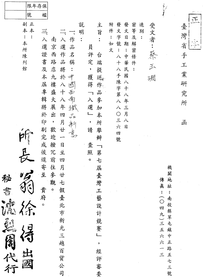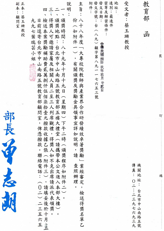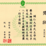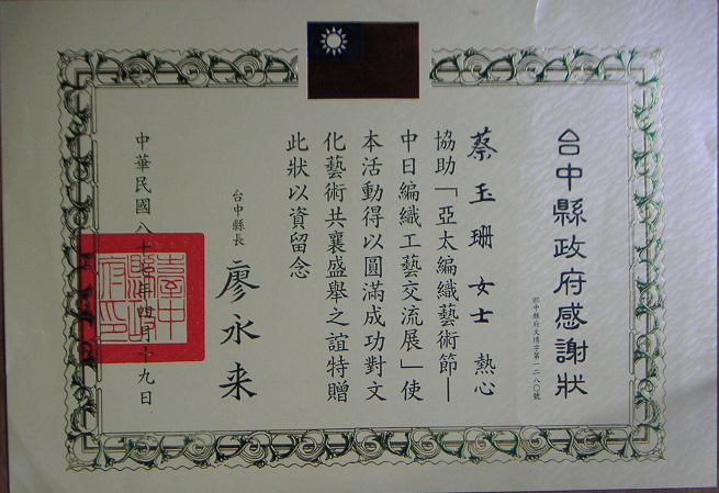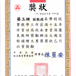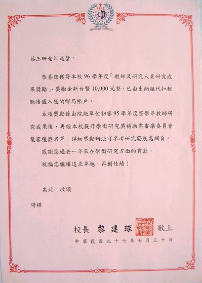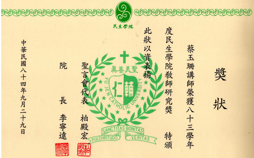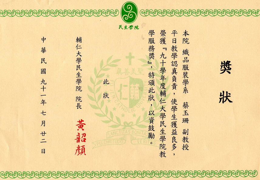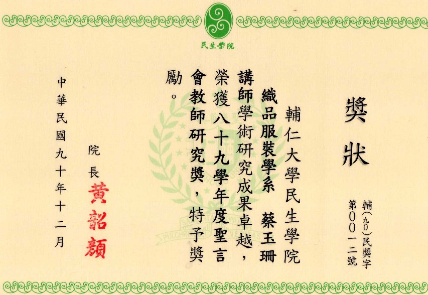 得獎紀錄 2008教研獎 2002教學服務獎 2001教師研究獎狀 1999織品入選 1999教師研究獎 1995教師研究獎 1990沙漠入選 1984 ANAT織品 97教學服務滿十年 89年度感謝獎 88年度教師研究獎 88年度教育部獎 88年度教育部獎 87年亞太感謝狀 84年度教師研究獎 15年大勇獎 101sabbatical 1981 Toison d’Or Delorme 1982Miro Meccano
