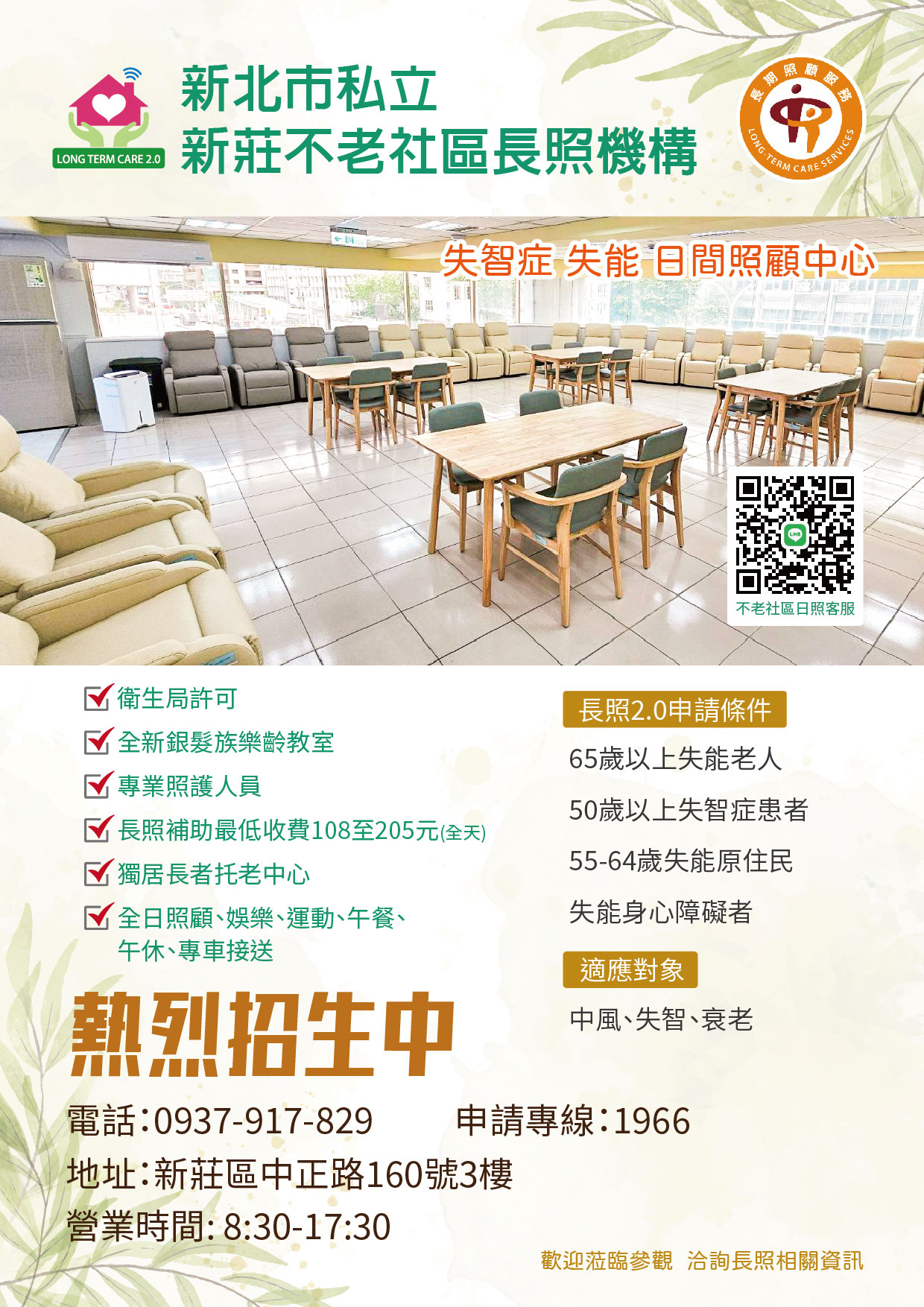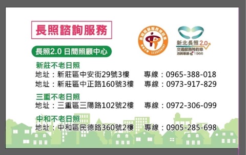 2020年11月,本會在新北市新莊區、2021年12月在三重區、2022年5月在中和區,先後成立「中華民國長期照護推廣協會 附設新北市私立不老社區長照機構」社區日照中心「不老日照,協助社區長者復健,減緩失能與失智。